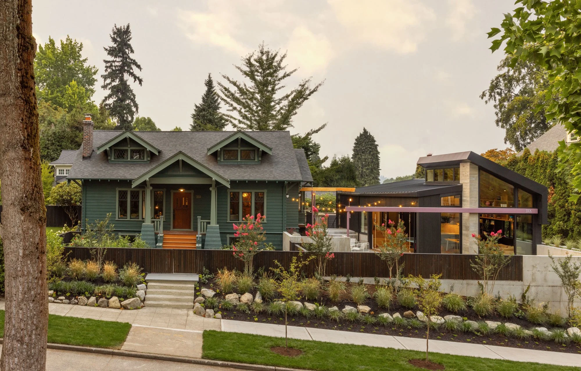 Architecturally, Park PAD strikes a dialogue between contrast and continuity. The existing craftsman’s deep green siding and intricate windows are complemented, not imitated, by the new structure’s dark vertical cladding, board-formed concrete, and muted pink steel elements. Together, they form a conversation between old and new: the warmth of tradition meeting the clarity of modern form.